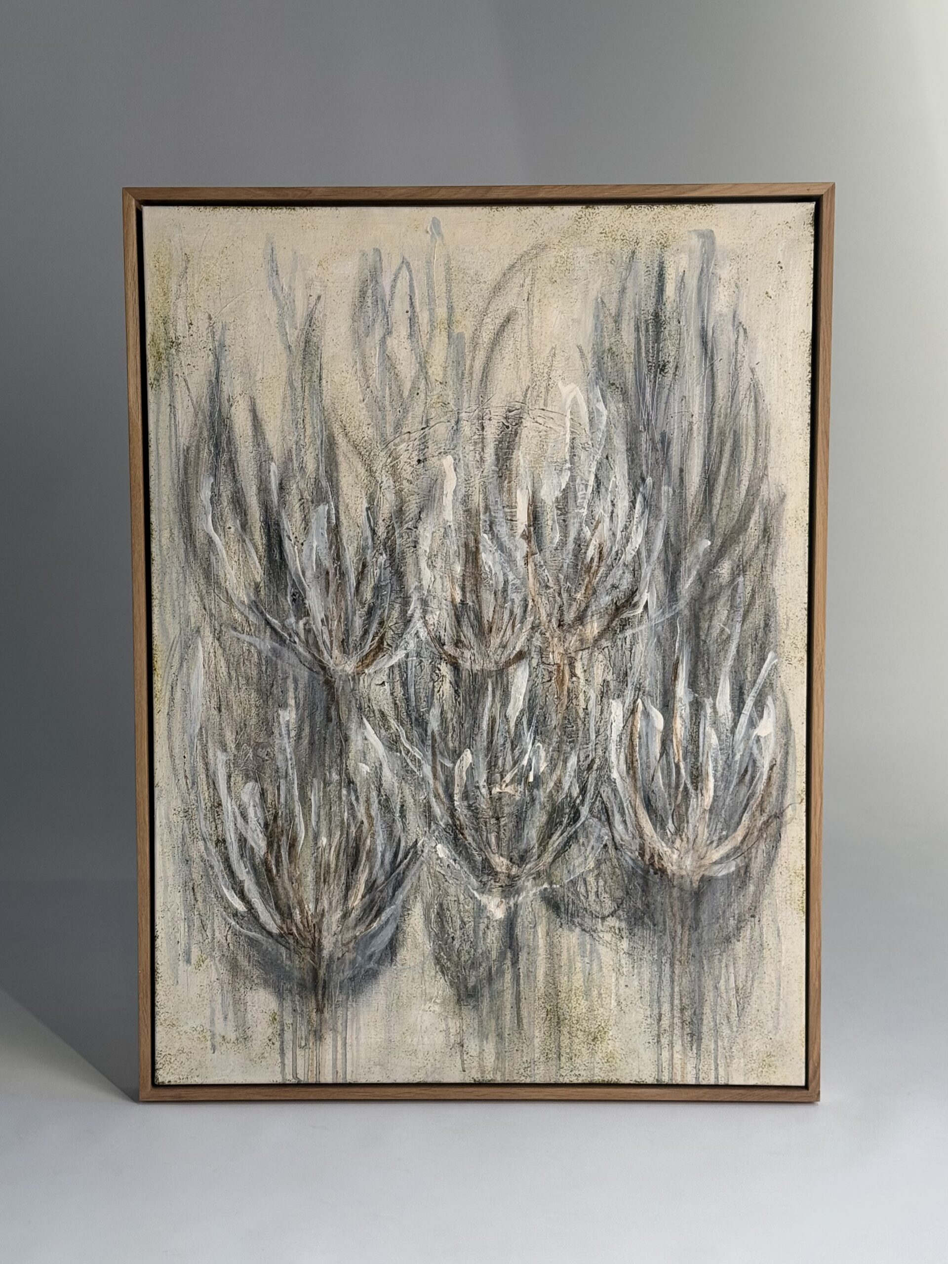 Eesti kunstniku Piret Elli pool valminud akrüülmaal ”Mingid lilled unises hoovis”. Maali ümbritseb männipuidust raam.