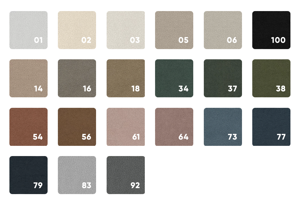 Beež 02, Dark Taupe 16, Helebeež 03, Helehall 83, Heleroosa 61, Kliendi valik, Light Taupe 05, Mereroheline 34, Meresinine 77, Must 100, Oliiviroheline 38, Pruun 56, Sand 06, Taevasinine 73, Taupe 14, Terrakota 54, Tumebeež 18, Tumehall 92, Tumeroheline 37, Tumesinine 79, Valge 01, Vanaroosa 64