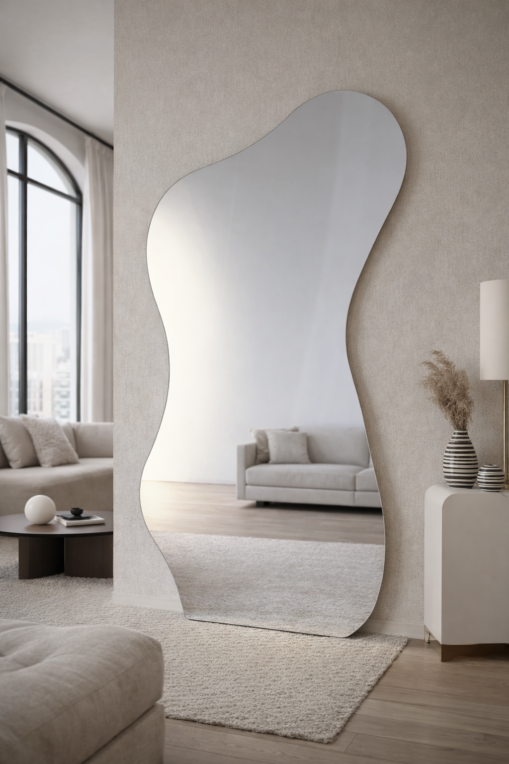 Skulpturaalse joone ja pehme orgaanilise vormiga seinapeegel, mis toimib ruumis nii praktilise elemendi kui ka pilkupüüdva disainiobjektina. Vabavoolav kuju lisab interjöörile liikumist ja isikupära, sobitudes suurepäraselt nii modernsetesse kui ka eklektilistesse ruumidesse.