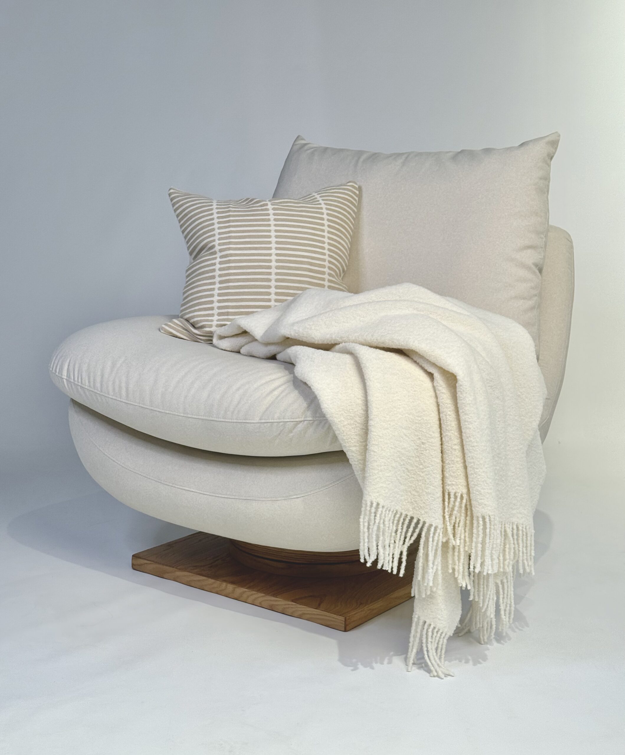 Minimalistlik vorm koos puidust alusega lisab interjöörile soojust ja ajatut elegantsi. Neutraalne kangas sobitub erinevate sisekujundusstiilidega, tuues esile nii modernse kui ka klassikalise kodu iseloomu.