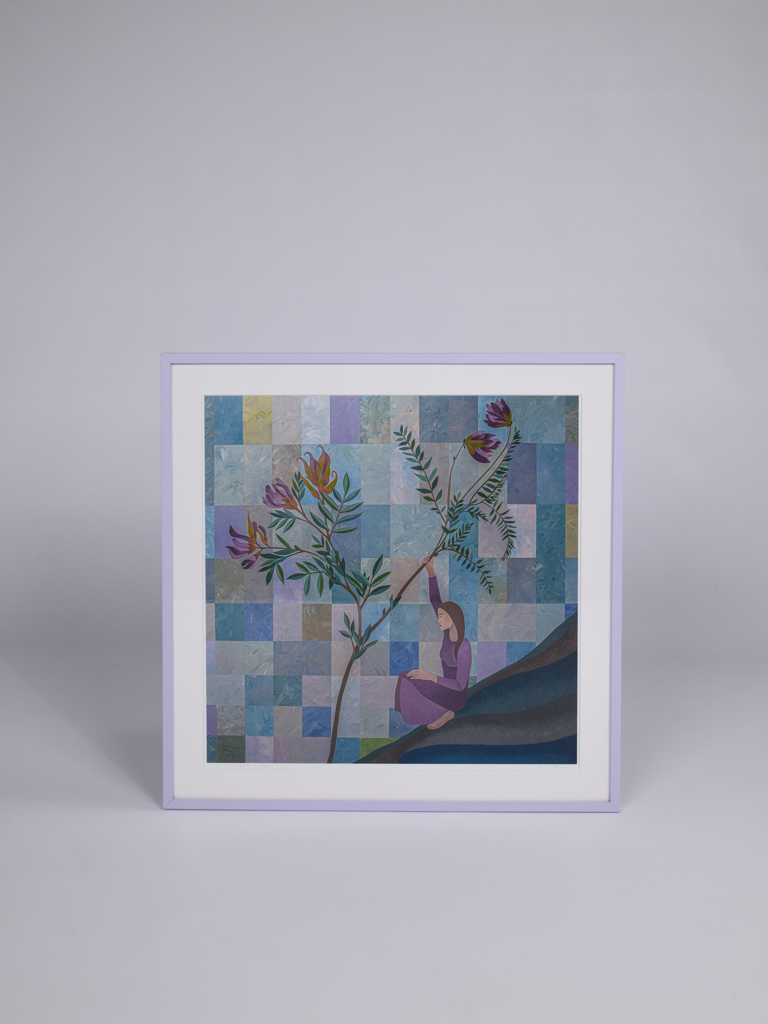 Eesti kunstniku Anna Kõuhkna signeeritud reprodutsioon maalist ”Navigating”. Pilti ümbritseb lilla puidust raam. Pildi suurus on 50x50cm ning raami suurus 60x60cm.