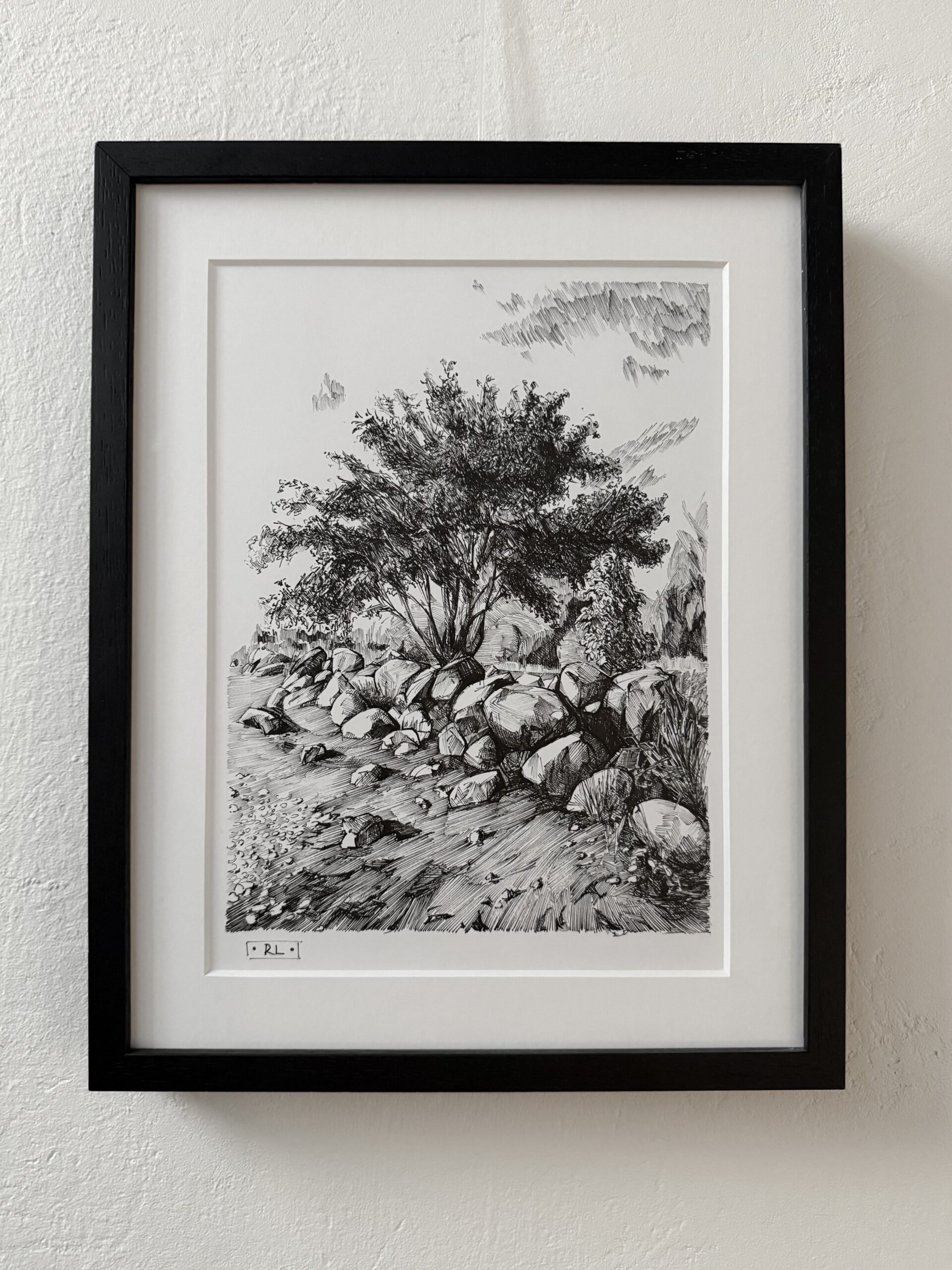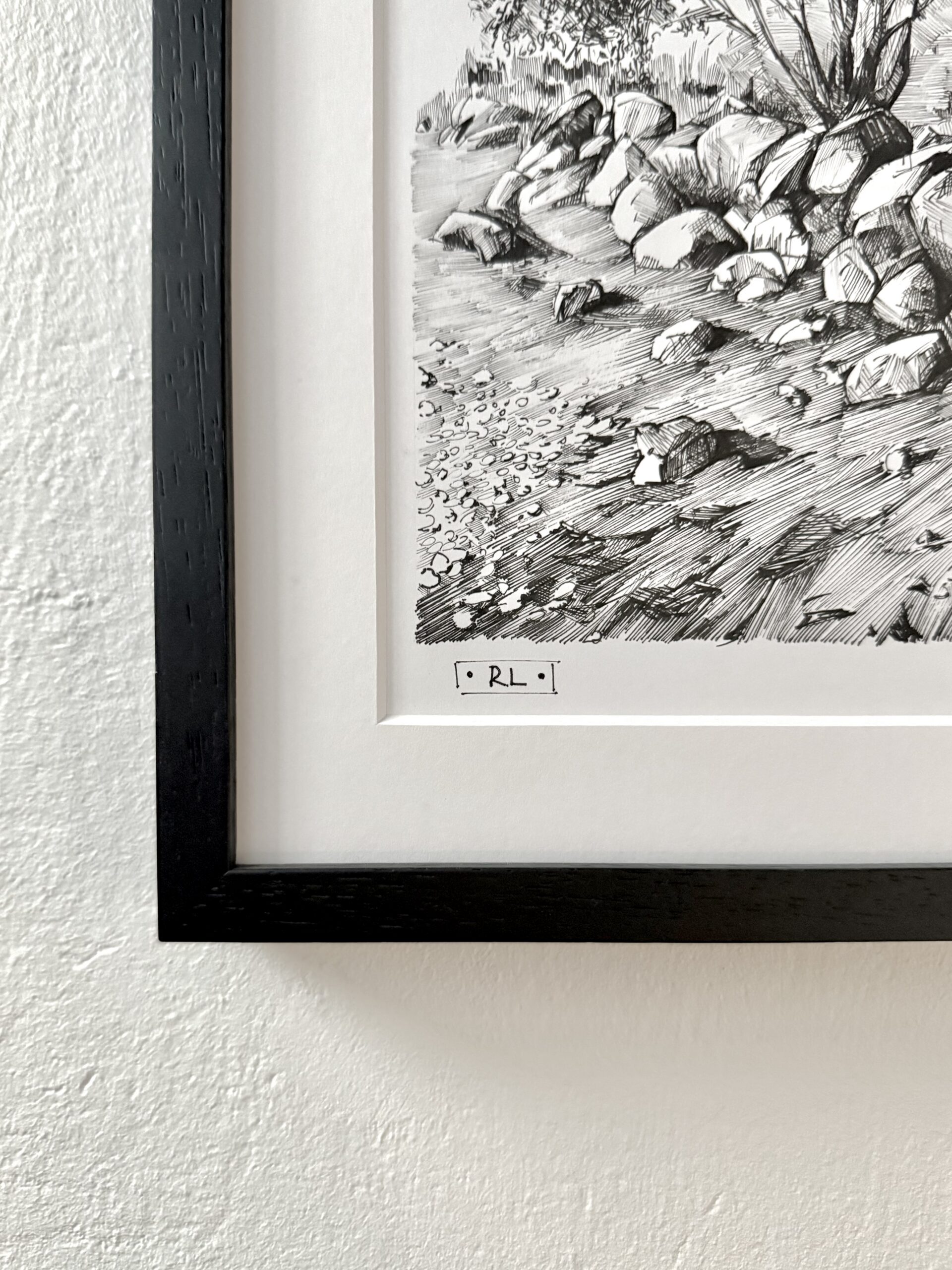 Rimo Lausmaa raamitud joonistus “Traces of the Sea” 29×37